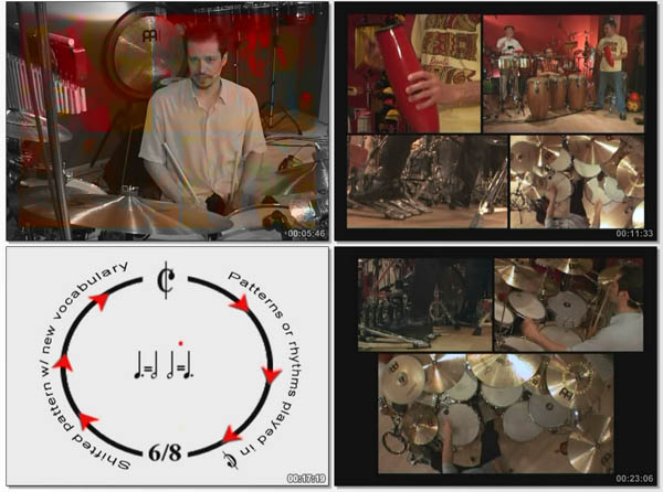 the patterns played on the original instruments then learn how to adapt everything you see on the drumset, all with close-ups and detailed explanations.